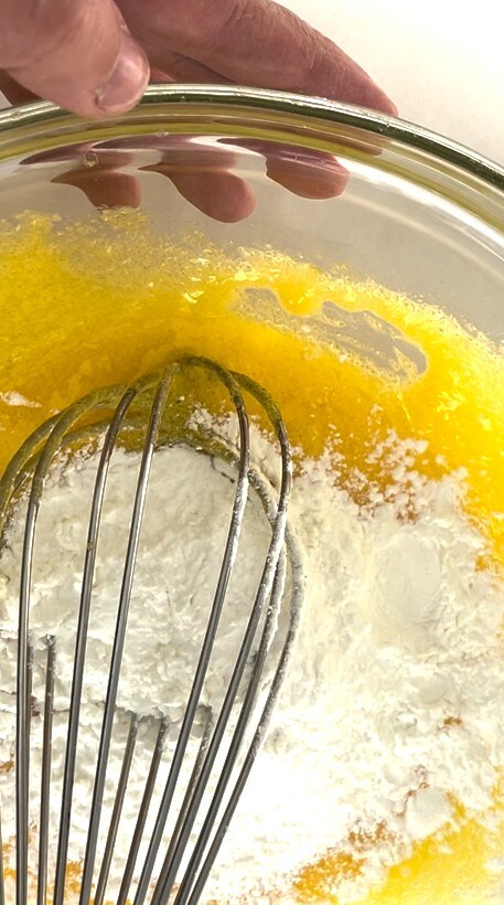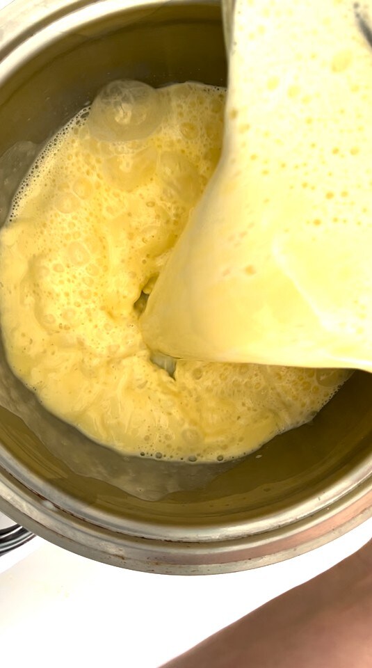 Neste ponto, o leite já estará quente e pode ser adicionado na tigela com os ovos.
