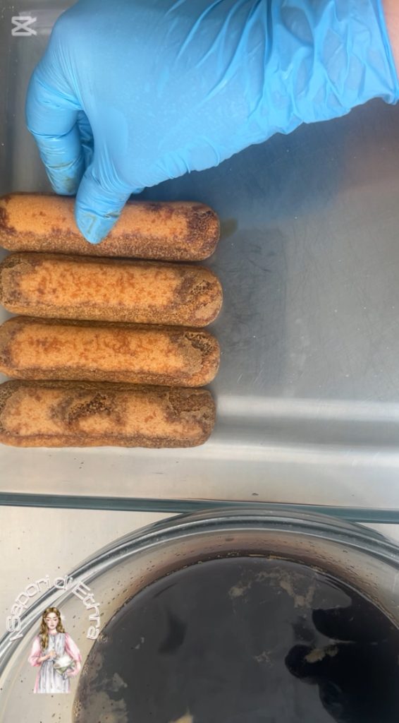 • Em uma tigela coloque o café expresso que adoçamos (pode ser também o da moka). Adicione um copinho de licor San Marzano ou, se preferir, o marsala ou o rum.