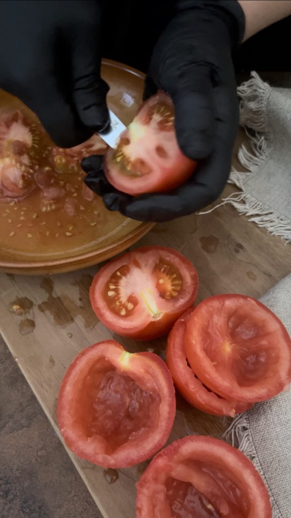 Com uma faca ou um escavador, esvazie os tomates rama e coloque a polpa em uma tigela.