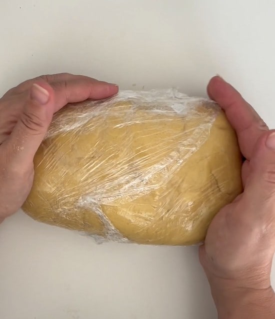 • Transfira para uma superfície e trabalhe rapidamente até obter uma massa lisa, que será colocada na geladeira para descansar por 1 hora