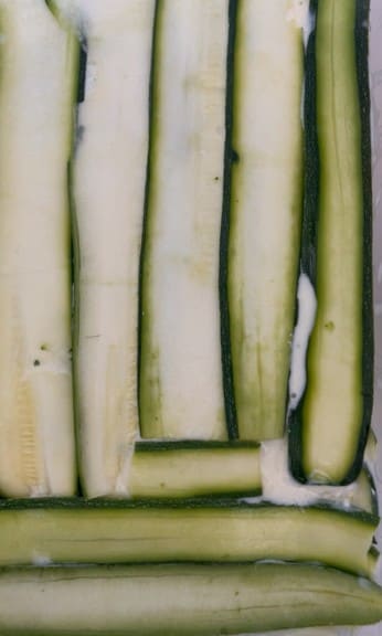 Arrume as fatias de abobrinha, previamente cortadas em fatias finas com uma mandolina, sem sobrepor