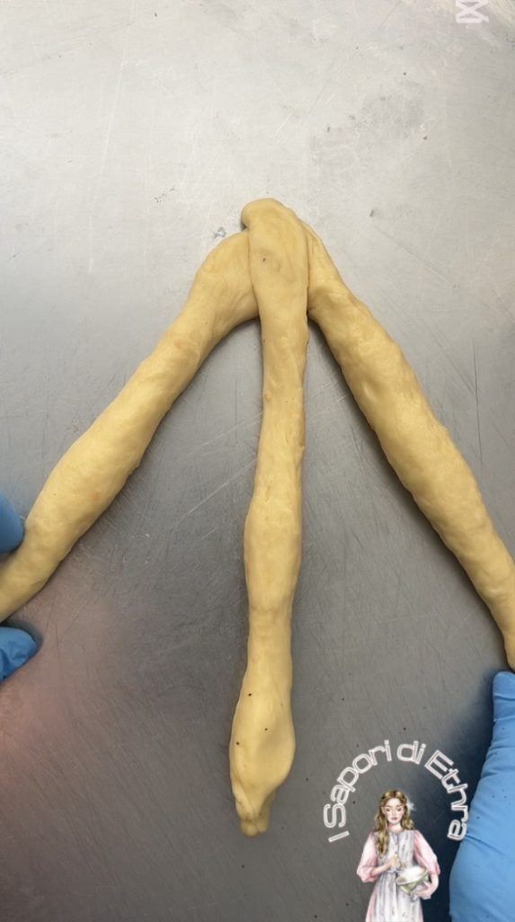 • Trabalhar com a batedeira planetária até que a manteiga esteja completamente absorvida pela massa e tudo esteja macio, elástico e homogêneo. Isso levará cerca de 15 minutos. Colocar a massa em uma tigela para fermentar coberta com filme plástico por cerca de 16 horas na geladeira. Eu deixo na geladeira durante a noite. Se você estiver com pressa, pode fermentar no forno desligado com a luz acesa por cerca de 4 horas e dar forma às tranças.