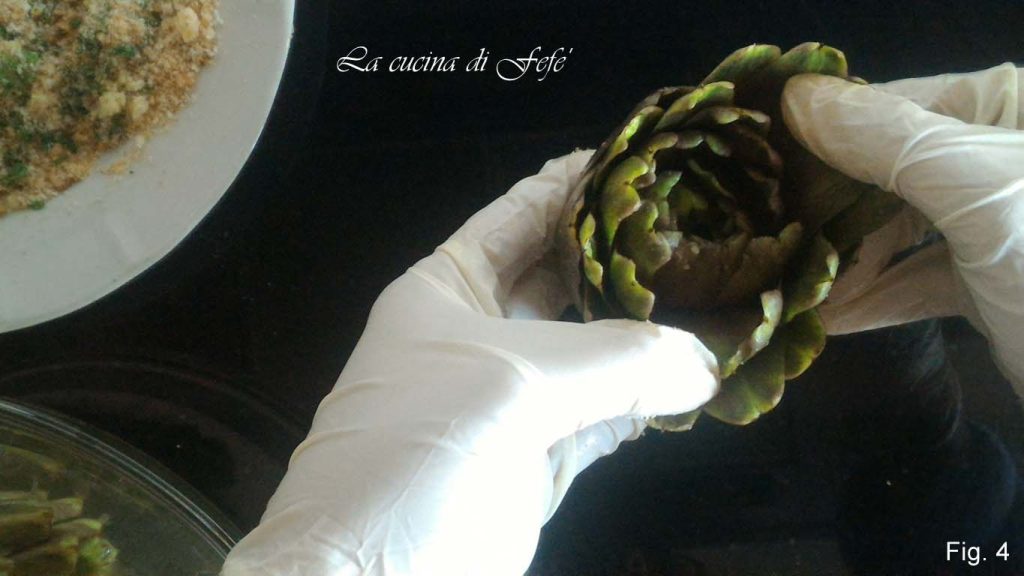 Escorra bem cada alcachofra, depois abra-a no centro com as mãos para permitir que todo o tempero alcance cada parte (fig. 4).