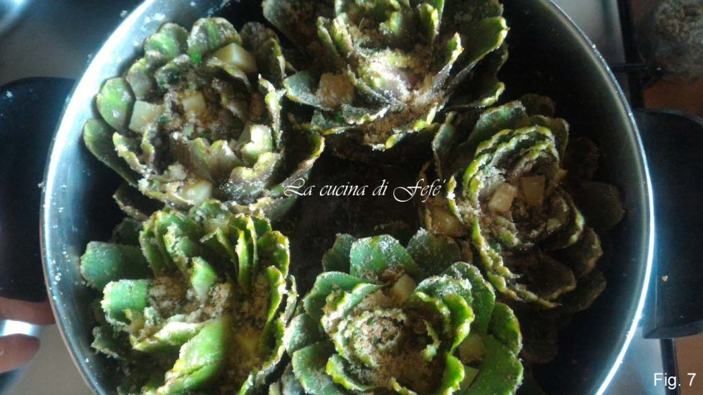 Adicione alguns cubos de caciocavallo ou tuma siciliana no coração da alcachofra e entre as pétalas mais externas (fig. 2).
