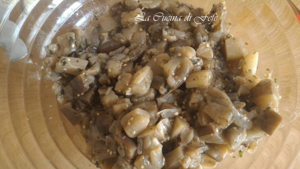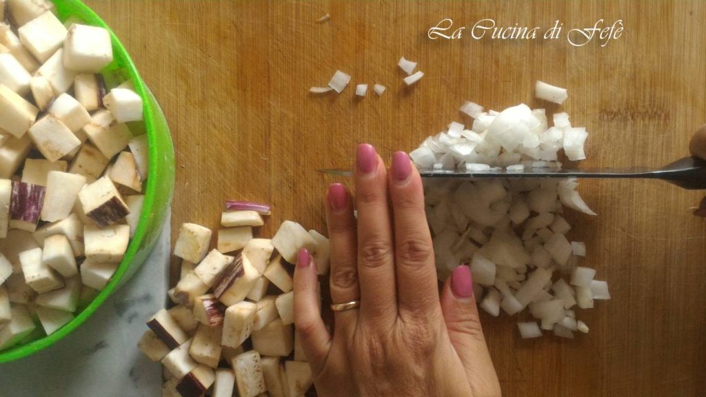 • Lave as berinjelas em água corrente, retire o pedúnculo com uma faca e então corte-as em fatias de 1,5 cm de espessura no sentido do comprimento, depois em bastões e finalmente em cubos.