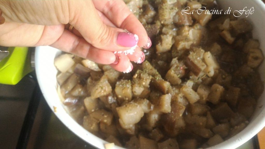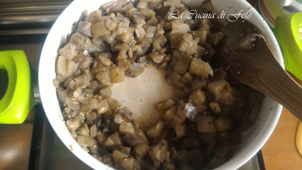 • Adicione os cubos de berinjela e deixe refogar por 2 minutos em fogo alto.