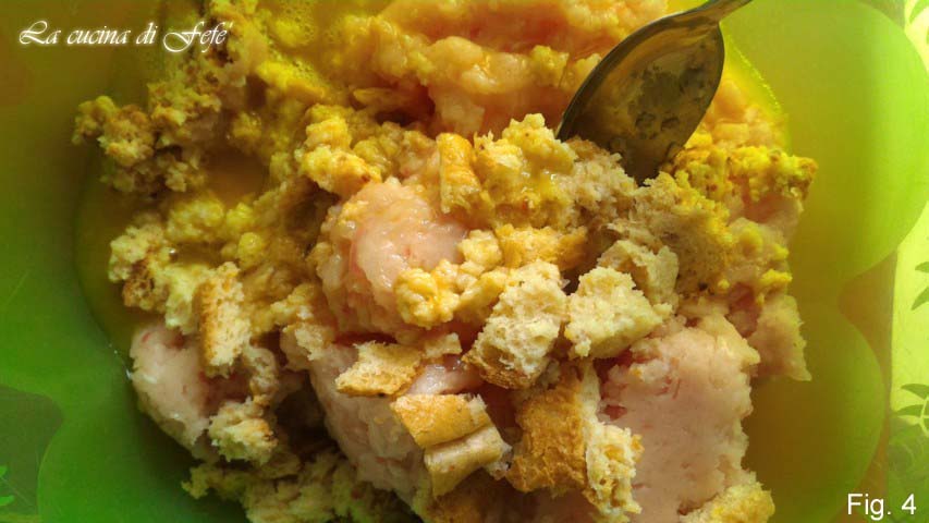 • Coloque em uma tigela junto com o pão embebido com um pouco de leite e bem espremido, os ovos previamente batidos com uma pitada de sal e comece a amassar com as mãos ajustando a consistência com um pouco de farinha de rosca, mas somente se necessário (fig. 4).