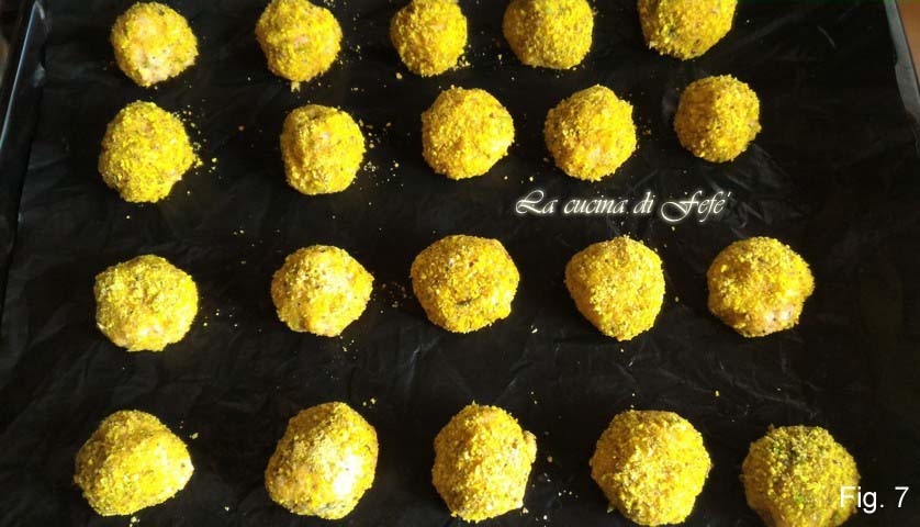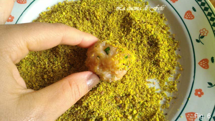 • Misture e com as mãos sempre ligeiramente úmidas formem bolinhas um pouco maiores que uma noz e passe na farinha de pistache para empanar (fig. 6).
