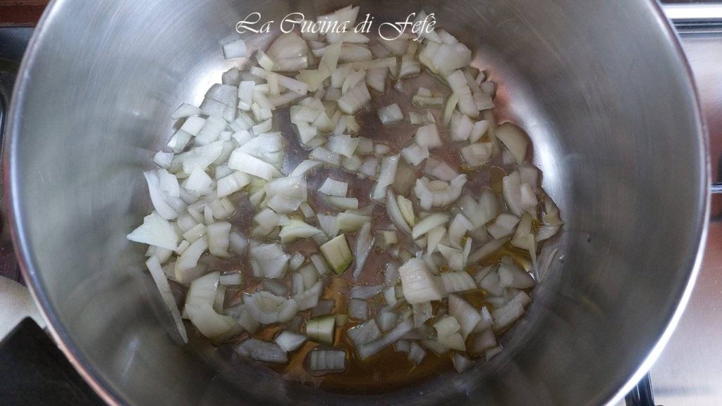 • Em uma caçarola grande, doure em fogo alto a cebola picada com um bom fio de azeite por alguns minutos sem deixar queimar.
