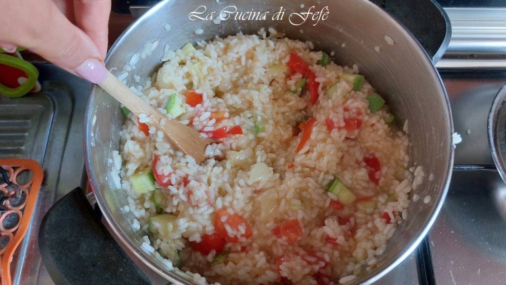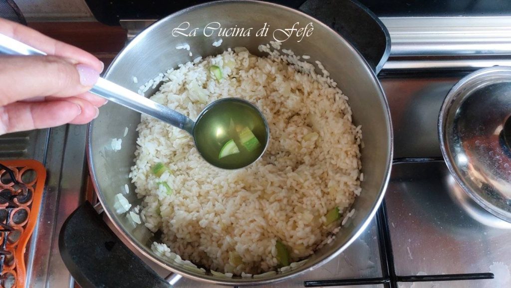 • Continue assim, adicionando mais caldo apenas quando o anterior tiver sido absorvido; após cerca de 5′ adicione os outros legumes e regue com mais caldo sempre bem quente.