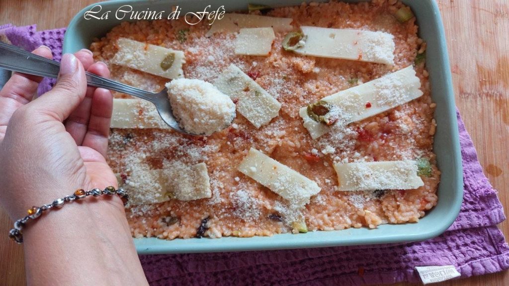 🟣 A escolha do queijo picante: eu usei um canestrato primosale siciliano bem picante e temperado com azeitonas e rúcula porque dá personalidade ao prato, mas se preferir, pode optar por qualquer outro queijo de massa filada ou muçarela em cubos bem escorrida. Neste último caso, eu adicionaria entre duas camadas de arroz e completaria com uma polvilhada mais abundante de grana.