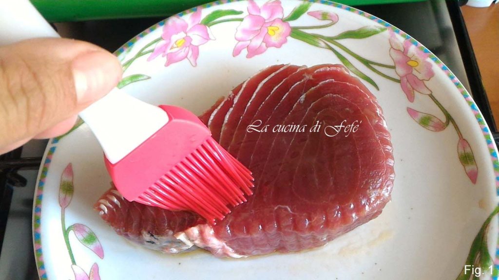 • Pincele os filés de atum com 2 colheres de azeite de cada lado (fig. 1).