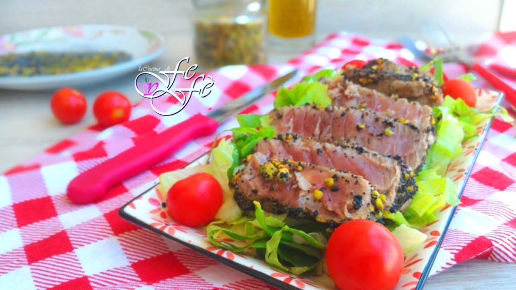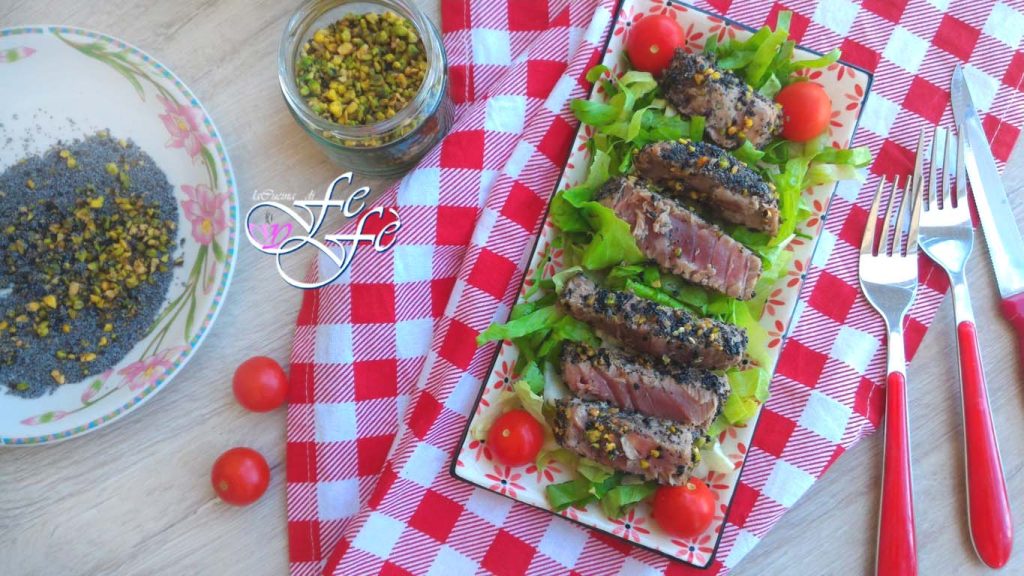 Após uma breve pausa de verão e alguns dias de descanso na casa de praia, voltei cheia de entusiasmo e ideias simples, mas saborosas, para propor na cozinha! Espero que vocês tenham sentido minha falta como eu senti de vocês, mas às vezes é realmente necessário desconectar de tudo e de todos, para poder se regenerar e recomeçar com o pé direito! Confesso que, aproveitando estes dias de férias, tentei me manter um pouco mais na linha, e estas primeiras receitas serão focadas em ingredientes que inspiram sabor, mas sem exageros! O que, por exemplo, proponho hoje é um prato simples nos ingredientes e no procedimento, mas de excelente rendimento e com um grande efeito visual, o que não é nada mau! Se, como eu, você ama atum rigorosamente fresco e pistaches, então você precisa experimentá-lo! Os pedaços são muito macios e se desmancham na boca. A adição de pistache de Bronte e sementes de gergelim preto dá uma crocância especial externa que não posso descrever, você terá que experimentar pessoalmente! Apenas uma advertência. Embora fácil e rápido, esta receita, no entanto, apresenta armadilhas, sendo a principal o cozimento do atum! Para um resultado ideal, o filé nunca deve cozinhar demais, portanto, aconselho desligar o fogo cedo para evitar que a carne fique seca e dura, perdendo todo o seu sabor. Claro, eu recomendo três minutos de cada lado, mas dependendo da espessura, é necessário ajustar o tempo de cozimento. Além disso, como esses tempos são bastante curtos, certifique-se de que o atum foi previamente congelado para eliminar o risco de parasitas. Uma vez cozido, você pode servi-lo cortado em pedaços acompanhado, como eu fiz, com uma simples salada da estação ou, se preferir, com legumes no vapor. Confie em mim, você vai impressionar!