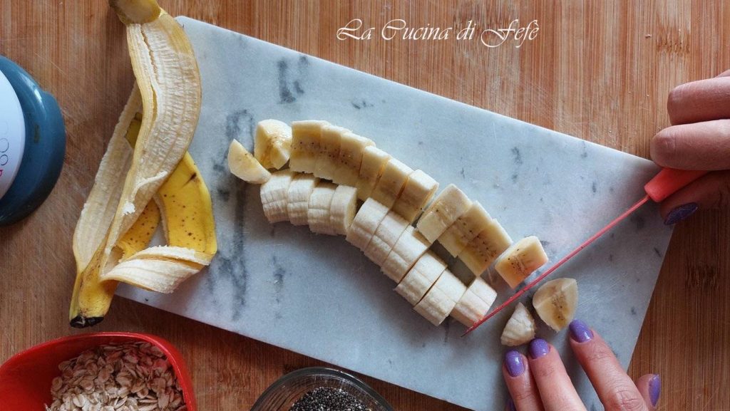 • Descasque uma banana e numa tábua de corte corte-a em rodelas.