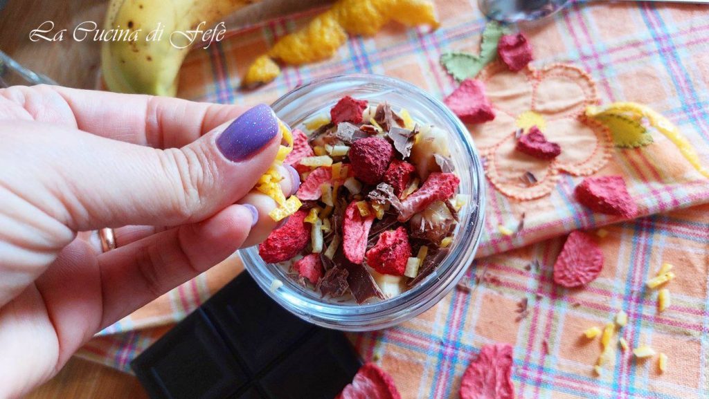 • Decore com fatias de banana, uma colherinha de manteiga de amendoim para cada um, uma pitada de morangos liofilizados picados grosseiramente com as mãos, chocolate amargo picado com faca e finalmente raspas de limão.