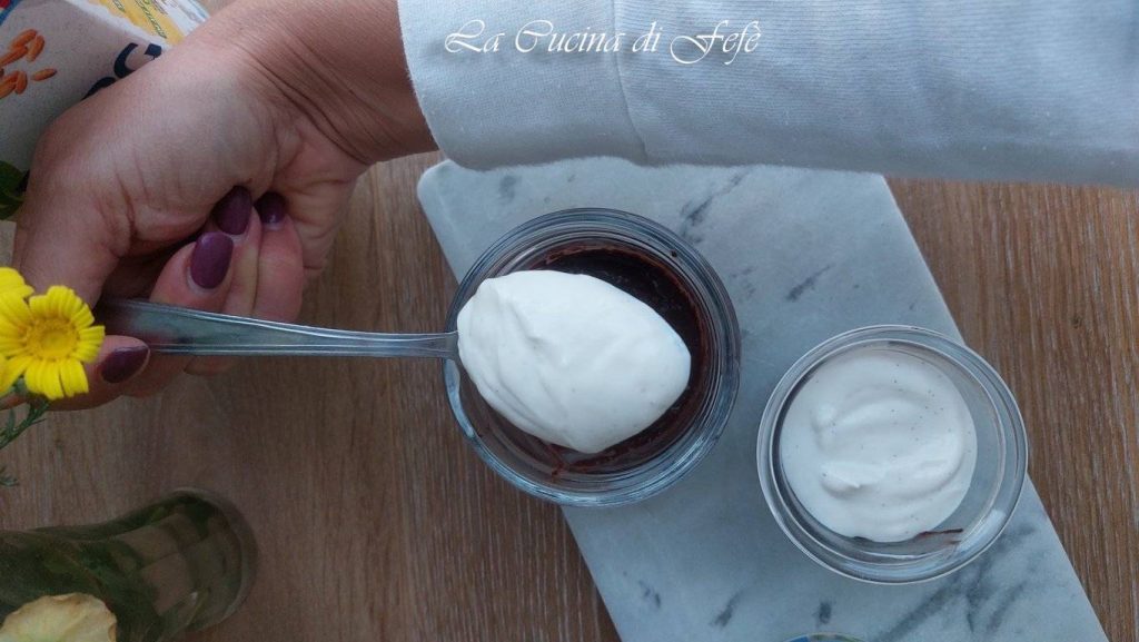 • Após o tempo de repouso, retire os potes com a mousse da geladeira e distribua o creme de iogurte por cima nivelando bem.