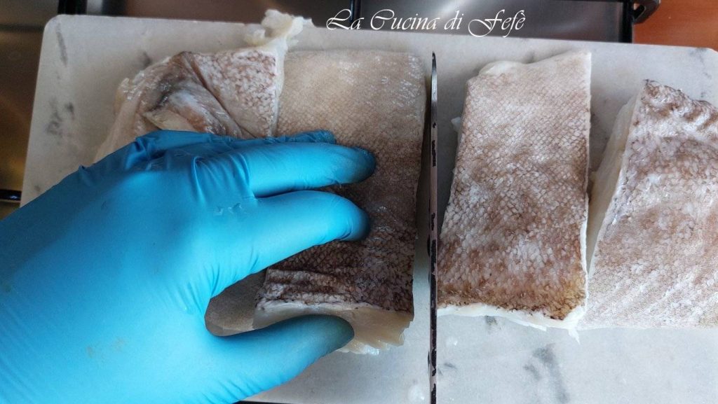 Enquanto isso, enxágue o bacalhau já demolhado e dessalgado em água corrente. Seque com papel absorvente e, com uma faca adequada para peixe, corte em postas.