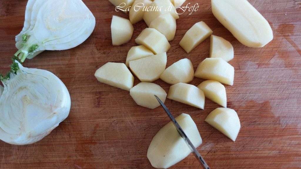 Comece lavando e limpando os vegetais: corte o funcho ao meio, removendo as partes mais duras mas preservando todas as barbas; descasque as batatas e corte em cubos médios.