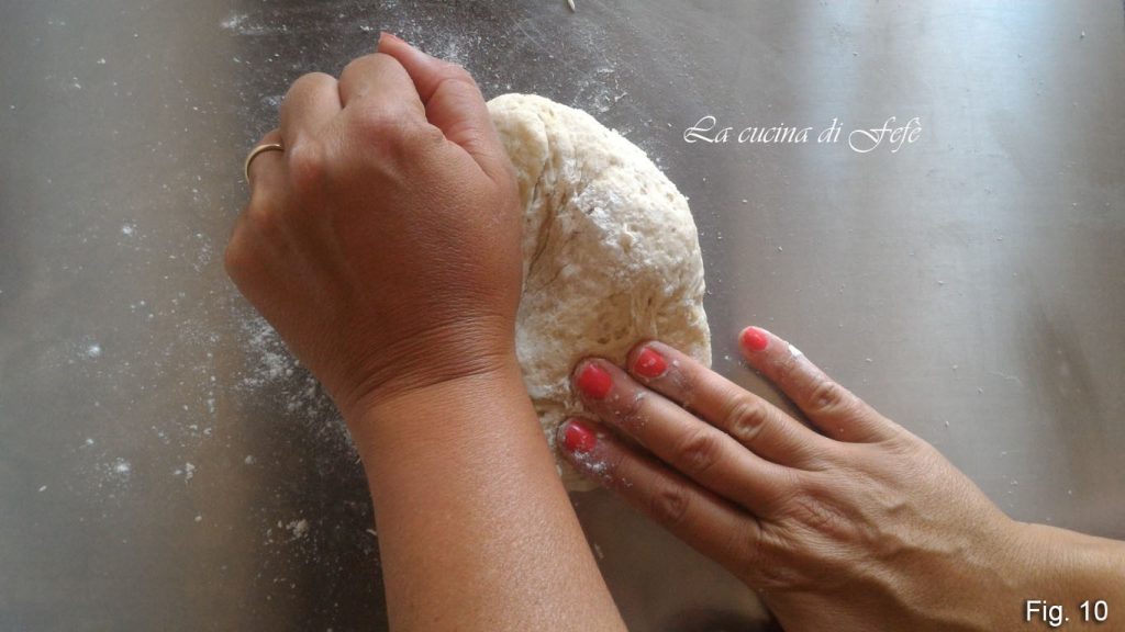 Quando a massa começar a ficar mais consistente, comece a trabalhá-la diretamente com as mãos na tigela.