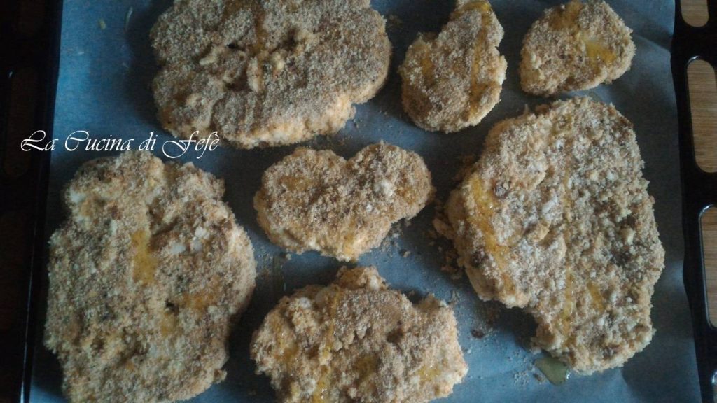 • Repita o processo com o restante das fatias e coloque-as em uma assadeira forrada com papel manteiga. Regue a superfície com 2-3 colheres de sopa de óleo e leve ao forno pré-aquecido a 200°C por 30′, então sempre com uma espátula vire-as delicadamente e continue o cozimento por mais 5′ ou até dourar.