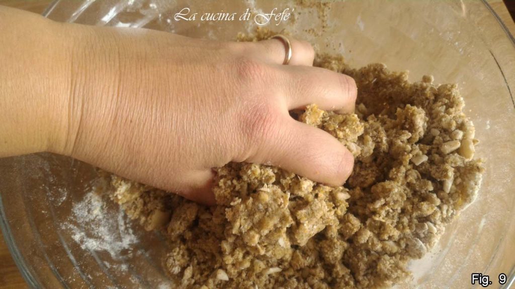 Quando a mistura se tornar mais sólida, comece a amassar à mão até obter uma massa compacta e granulosa (fig. 9).