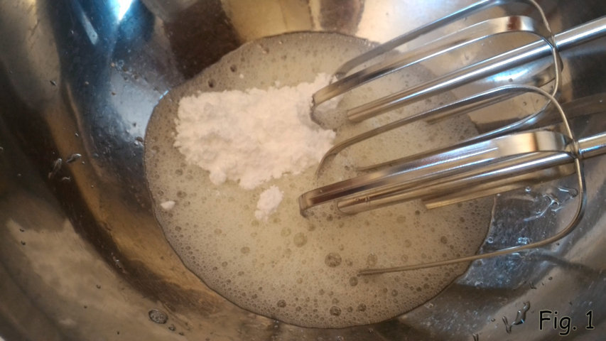 Comece a preparar primeiro o glacê real para tê-lo pronto quando você tirar seus biscoitos do forno. Coloque a clara de ovo em uma tigela com algumas gotas de limão, bata com o batedor elétrico em velocidade moderada até espumar levemente. Neste ponto, adicione o açúcar de confeiteiro peneirado, aos poucos (fig. 1)