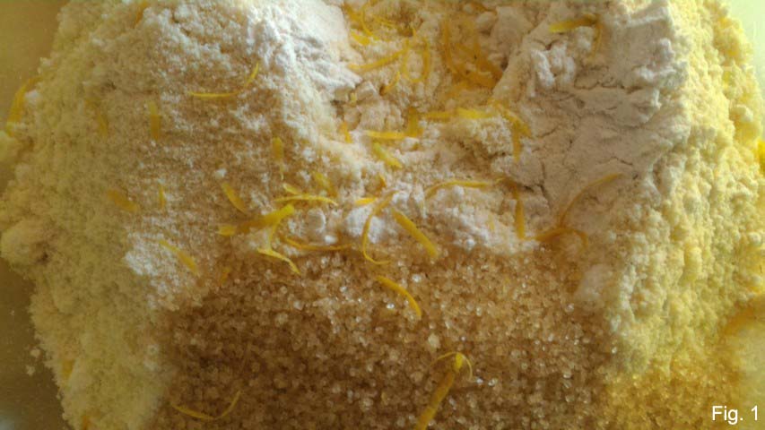 Em uma tigela grande, peneire as duas farinhas, adicione o açúcar e as raspas dos limões (fig. 1).