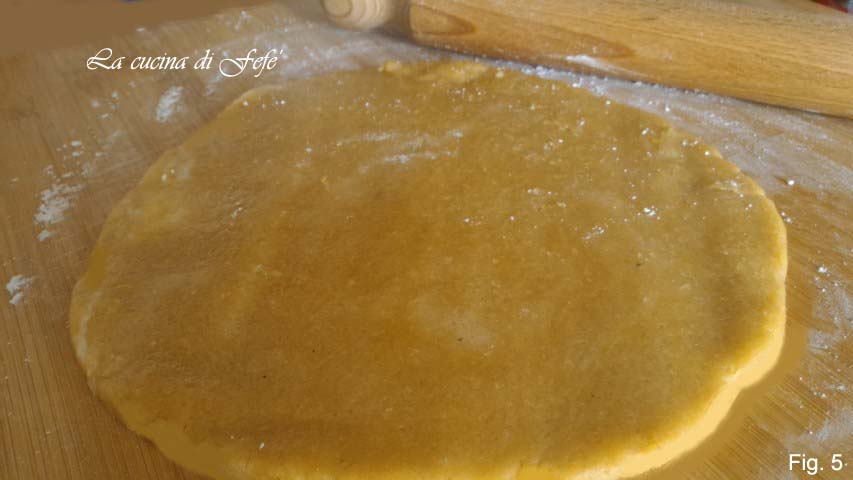 Cubra com filme plástico e deixe descansar na geladeira por cerca de 30 minutos. Após esse tempo, abra a massa com a ajuda de um rolo sobre uma superfície levemente polvilhada com açúcar de confeiteiro ou farinha, obtendo uma espessura de 1 cm (fig. 5).