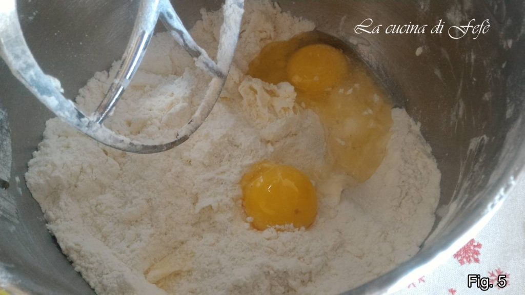 Com a raquete K, bata em velocidade baixa até obter uma mistura arenosa. Por fim, adicione os ovos e continue a bater (fig. 5).