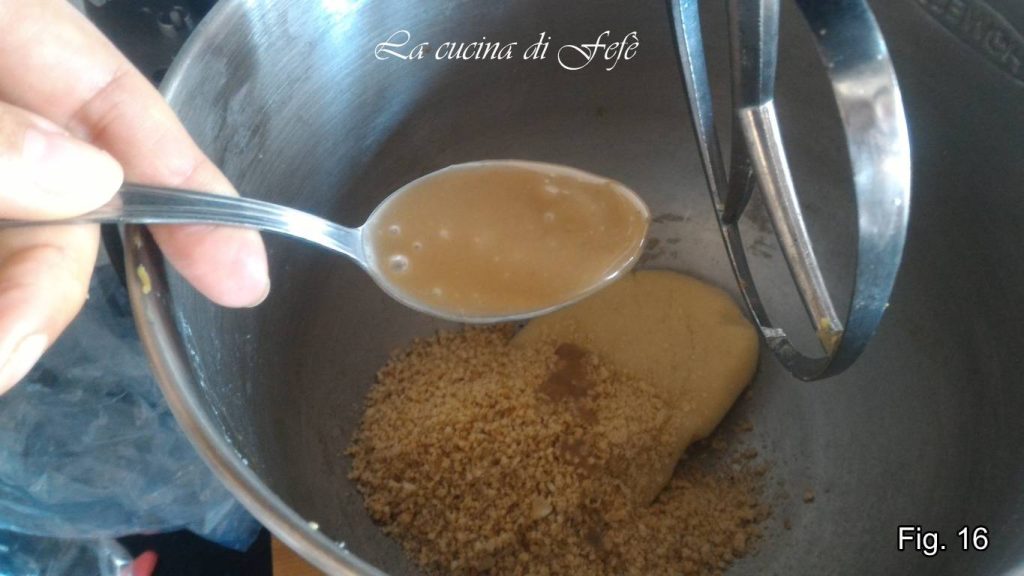 Bata com o gancho K por alguns minutos até obter uma massa homogênea. Achate-a, envolva-a no filme plástico e coloque-a no frigorífico 20′ (fig. 15).