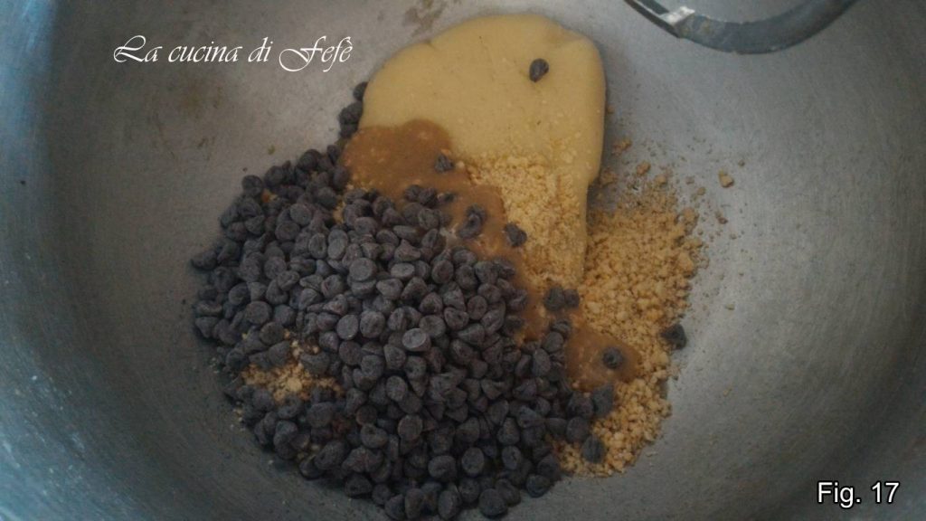 Para os cookies de avelã e gotas de chocolate (aprox. 12): pegue a última porção de massa e coloque-a na batedeira, adicione a farinha de avelãs ou avelãs previamente trituradas em um processador e o licor de avelã ou alternativamente 1 colher de sopa de leite (fig. 16).