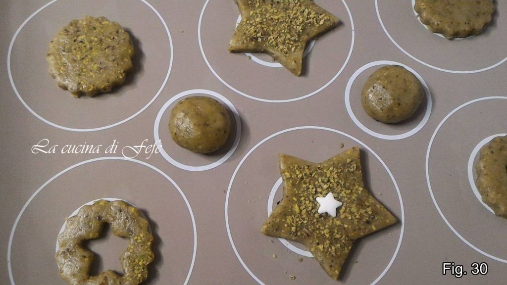 Com o resto da massa, faça um número par de bolinhas enrolando-as entre as mãos, e coloque-as em uma assadeira forrada com papel manteiga. Eu decorei com farinha de pistache e confeitos temáticos. Asse a 180°C por 10 minutos (fig. 30)