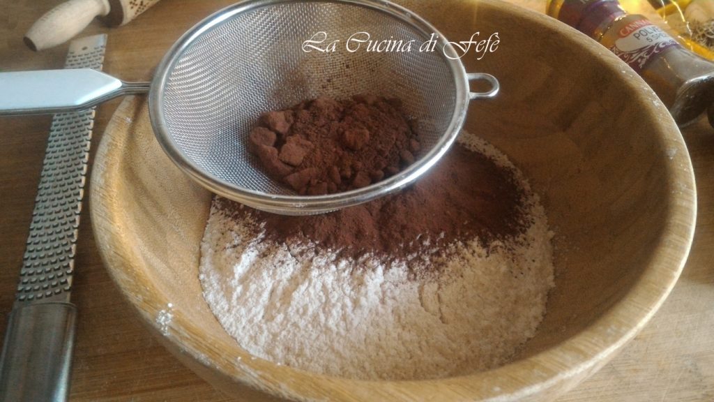 • Em uma tigela grande, misture as farinhas com o cacau em pó peneirando-as.