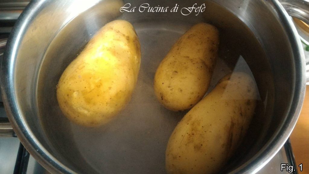Lave bem as batatas em água corrente, removendo todos os resíduos de terra. Coloque-as em uma panela sem descascar, com água salgada, leve à fervura e deixe cozinhar por cerca de 25′ ou até que os dentes de um garfo consigam penetrar (fig. 1).