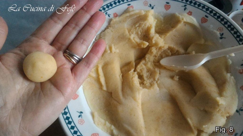 Após a preparação, a massa deve ser facilmente manuseável. Pegue pequenas porções da massa, enrole entre as palmas das mãos e forme bolinhas com peso de 8 gramas, se desejar mais crocantes, ou 10 gramas para uma versão mais macia (fig. 8). Transfira-as para uma assadeira forrada com papel manteiga e asse em forno ventilado a 170ºC por 25′, depois abaixe a temperatura para 160ºC, modo estático, por mais 15′ aprox. (fig. 9).