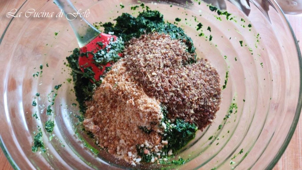 Junte também a farinha de rosca fina e as sementes de linhaça moídas e misture com uma espátula.