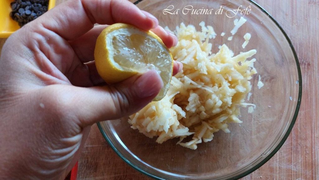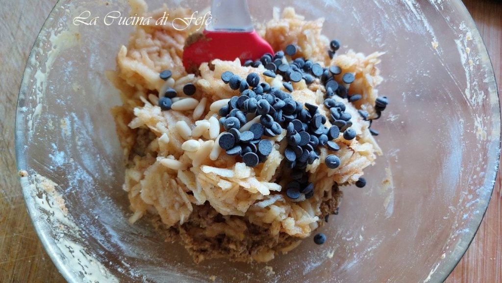 • A esta altura, incorpore também a maçã ralada, os pinoli levemente picados com a faca e as gotas de chocolate.
