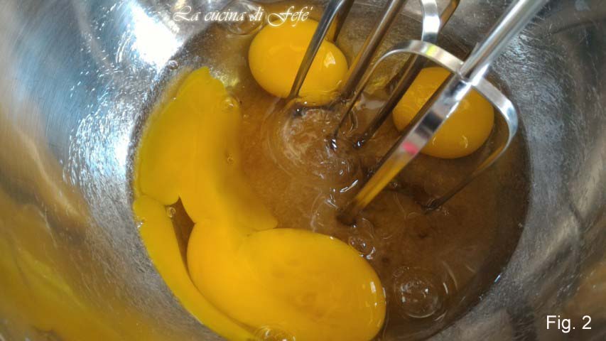 À parte, em outra tigela, bata com os batedores elétricos os ovos com o açúcar e o aroma de amêndoa por vários minutos (fig. 2).