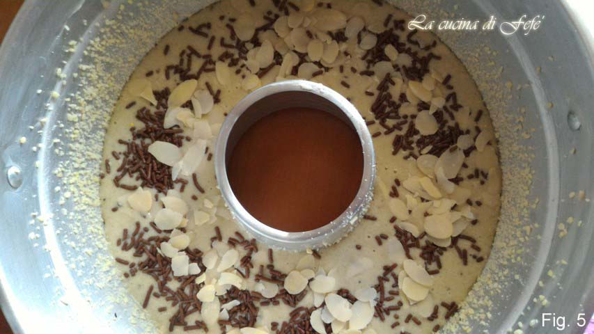 Em seguida, adicione também os outros ingredientes líquidos, alternando-os com as farinhas e o fermento previamente peneirados. Por último, as amêndoas, deixando algumas de lado, e 50 gr. de granulado de chocolate (fig. 4).