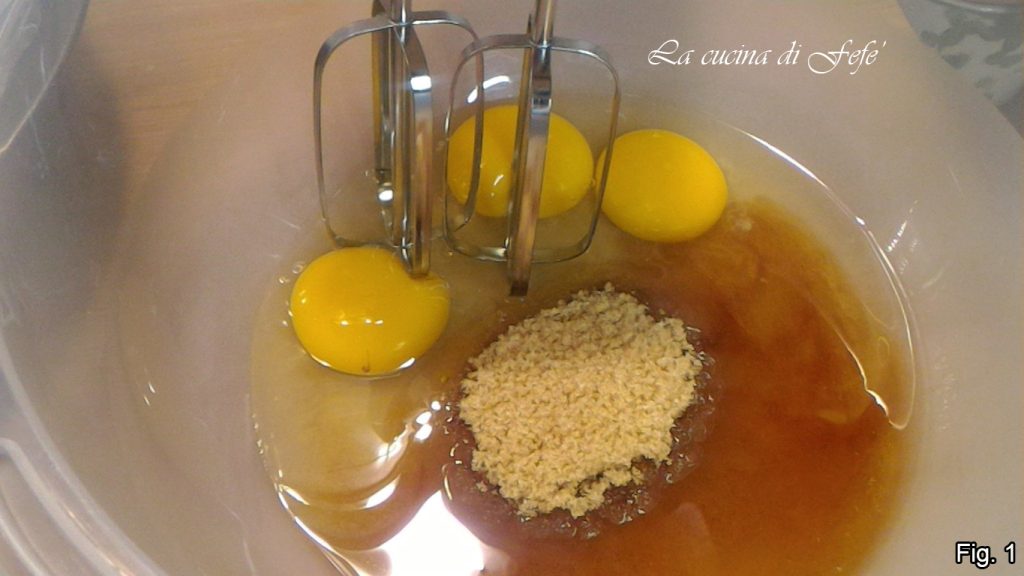 • Com os batedores elétricos na velocidade máxima, trabalhe dentro de uma tigela os ovos por 5′ com o açúcar (fig. 1).