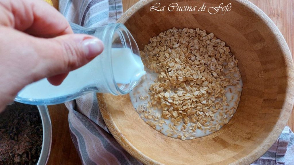 Em uma tigela grande, coloque os flocos de aveia*, despeje o leite de aveia quente, misture com um garfo e deixe descansar 5′ em temperatura ambiente, coberto por um pano.
