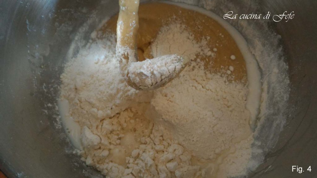 • Trabalhe por mais 2′. Comece a adicionar a farinha aos poucos, deixando que seja absorvida antes de incorporar a próxima. Assim que a mistura ficar firme, substitua o batedor pelo gancho ou continue à mão.