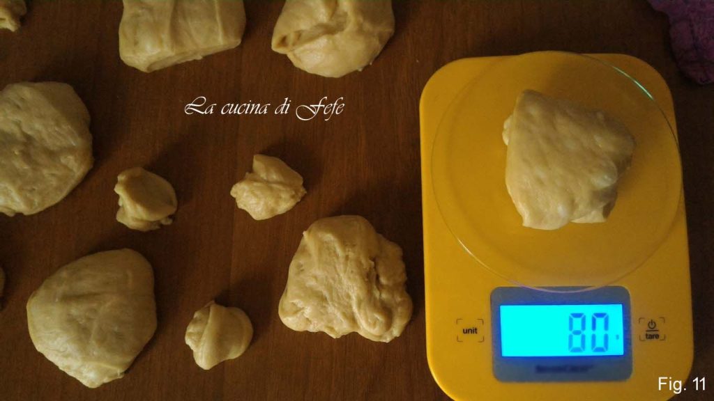 • Deixe crescer coberto por mais 2h. Em seguida, proceda ao corte da massa, criando cerca de 10 porções de 80 g e outras tantas de 15 g*.