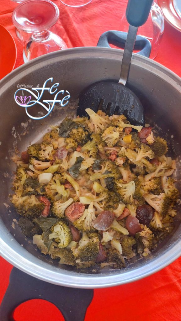 Regue com o vinho tinto, deixe evaporar em fogo alto a parte alcoólica, então abaixe o fogo e tampe com uma tampa. Cozinhe por 35′-40′, sem nunca destampar ou mexer. Apenas, de vez em quando, balance um pouco a panela para evitar que os brócolis grudem no fundo. Desligue e deixe descansar por 10′. Use uma espátula para soltar as bordas, então sirva.