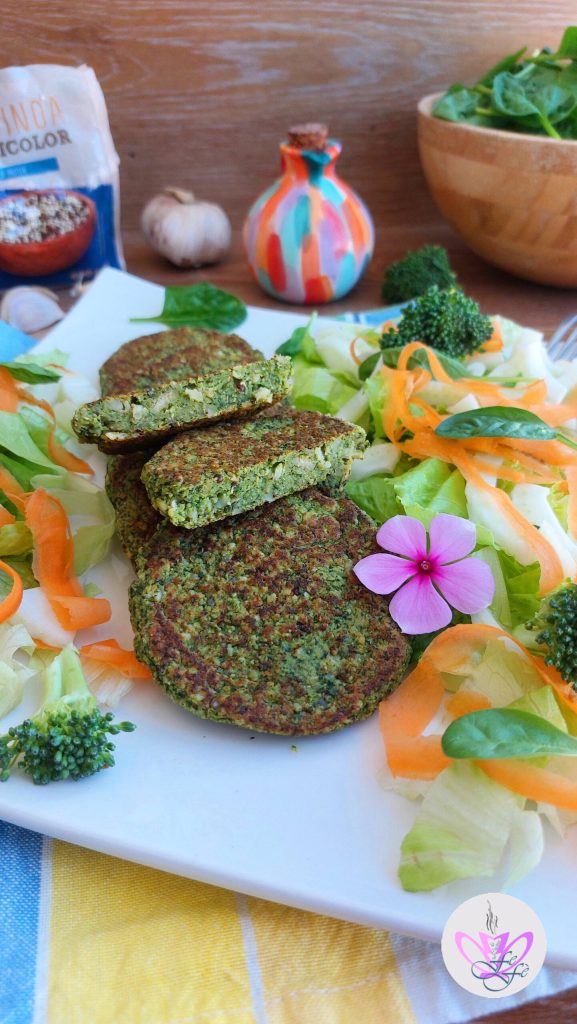 Algumas semanas atrás, enquanto fazia compras, confesso que fui atraída a comprar também hambúrgueres vegetais já prontos, daqueles que bastam alguns minutos na frigideira ou na fritadeira a ar para serem servidos à mesa! De vez em quando, há dias em que é difícil se organizar na cozinha e é conveniente ter algo rápido para colocar no prato! Claro que cedi ao encanto do produto pronto, porque a lista de ingredientes era absolutamente ótima, mas o sabor não me satisfez plenamente! Quinoa, espinafre e repolho eram os ingredientes principais, e ainda assim, pareciam um tanto insípidos! Então, decidi que poderia muito bem replicá-los em casa com melhores resultados, substituindo o repolho por floretes de brócolis ou, se preferir, outros vegetais que estejam sobrando na geladeira! Bem, o que dizer? O sabor do “feito em casa” não tem comparação e também é contra o desperdício de alimentos! Além disso, são preparados bastante rapidamente porque os brócolis são cozidos por poucos minutos em uma panela com um alho-poró e meia cebola e coloca-se tudo em um processador de alimentos! As quantidades que deixo aqui são perfeitas para uma família de 6 pessoas, caso contrário, uma vez cozidos, você pode congelá-los e descongelá-los conforme necessário! A quinoa, além disso, é um pseudocereal sem glúten, então basta substituir na receita o pão ralado comum por um sem glúten para ser adequado também para celíacos! No mais, são hambúrgueres vegetais, portanto adequados para toda a família e também para aqueles que seguem uma dieta vegana. Ricos em vitaminas, sais minerais e propriedades anti-inflamatórias e antioxidantes graças ao espinafre e aos brócolis, são perfeitos e práticos para preparar e levar também para o escritório, em um passeio ou como um jantar rápido!