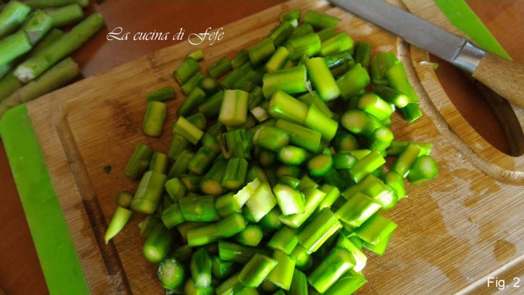 Raspe os talos com um descascador e corte-os em cubinhos. Escalde-os por 2′ em água fervente (fig. 2).