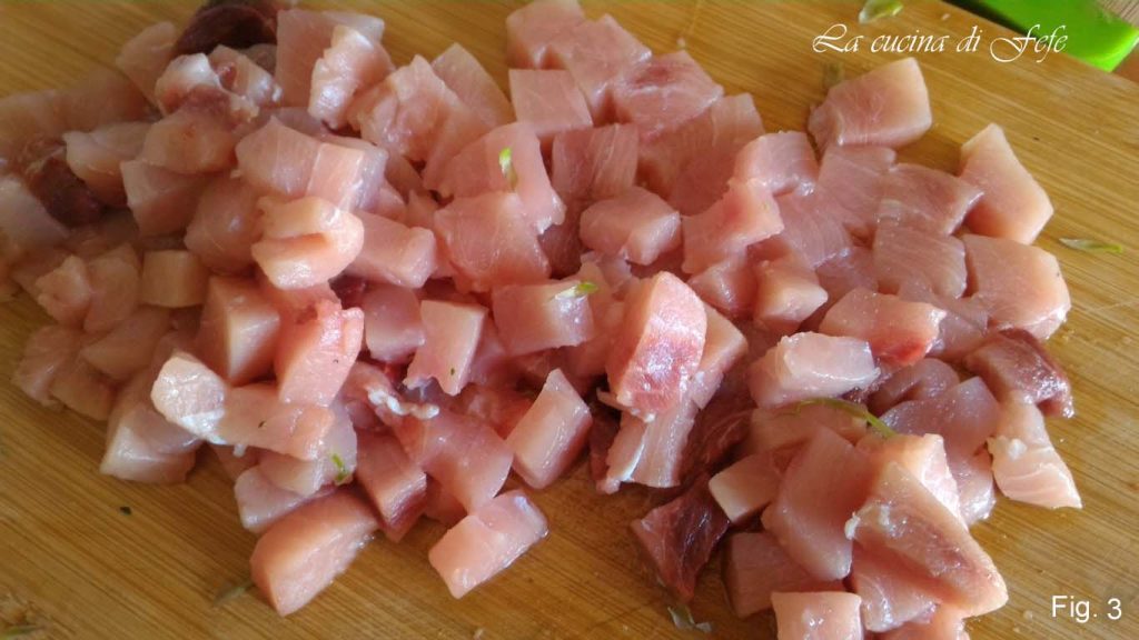 Corte o peixe-espada em pedaços, removendo a pele (fig. 3).