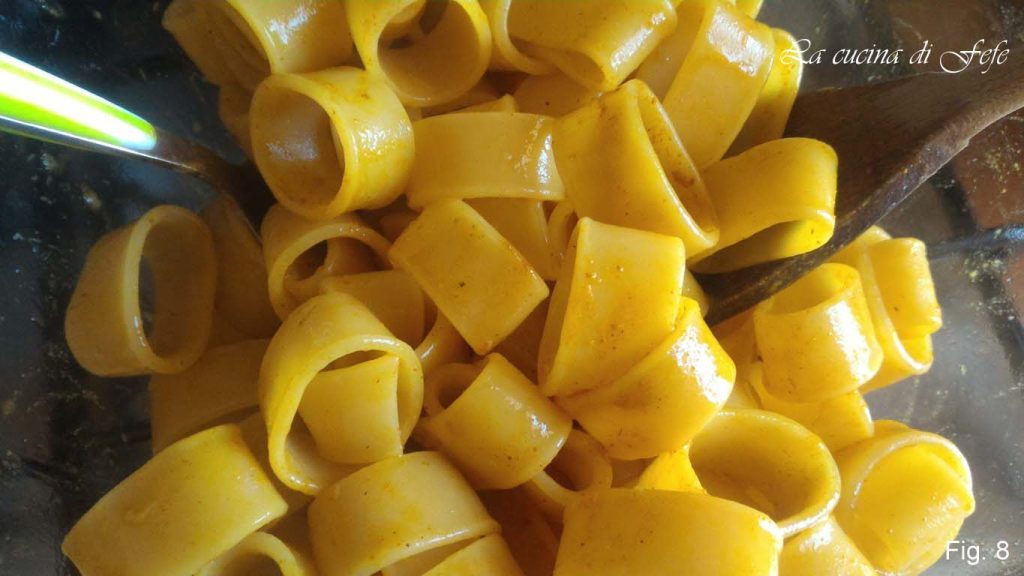 Escorra a massa al dente e transfira para a tigela com a água e a cúrcuma, depois misture bem e deixe pegar sabor (fig. 8).
