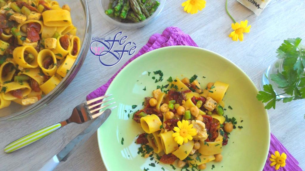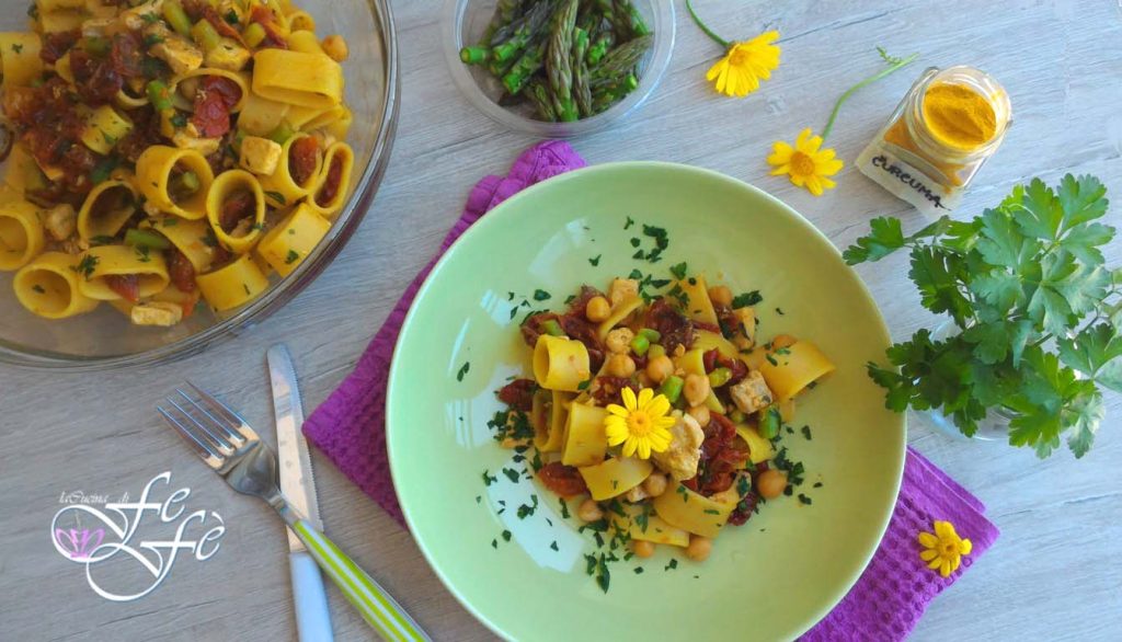 Para começar a semana, hoje proponho uma receita que preparei no último final de semana, aproveitando os últimos tomates secos de Pachino, presenteados pela amiga Gaetana Picone, também blogueira de culinária, durante nosso encontro na Sicília no outubro passado! Ela me deu tantos, que tive que comprar uma máquina de vácuo para conseguir manter inalteradas suas propriedades organolépticas! Mas valeu muito a pena! Resultado: um primeiro prato à base de peixe de dar água na boca!!! O molho de peixe-espada, a saborosidade dos tomates e a crocância dos aspargos ligeiramente escaldados, tornaram este primeiro prato realmente fantástico tanto que, apesar de eu e meu marido termos prometido a nós mesmos não repetir para começar a controlar um pouco as quantidades e calorias, não conseguimos seguir essa regra! O conjunto foi então ainda mais saboroso com a água de cozimento misturada com cúrcuma, uma especiaria que eu adoro e que garantiu uma cor âmbar e um sabor aromático que ficou maravilhoso! A escolha do formato da massa é o que mais me agrada quando cozinho peixe, perfeito, na minha opinião, para manter o cozimento e ficar firme no ponto certo. No entanto, vocês poderão optar pelo que mais desejarem ou tiverem disponível na despensa. Será delicioso de qualquer forma!