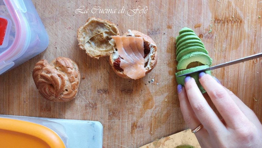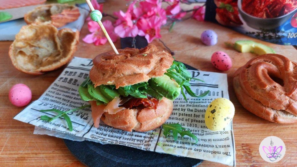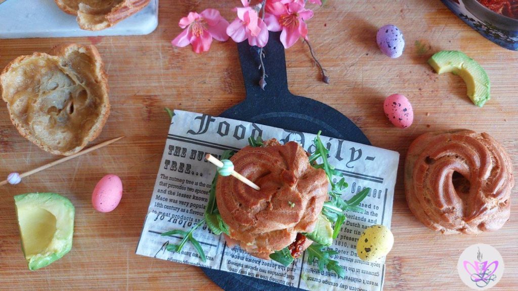 Este ano, depois de preparar minhas super testadas zeppole de massa choux como sempre para a festa de São José, decidi fazer uma versão salgada com minha inseparável farinha de beterraba! Esta farinha deu uma bela cor à massa, que infelizmente se perdeu um pouco durante o cozimento, mas o sabor estava top! São carolinas neutras, portanto perfeitas para rechear conforme necessário, seja com um creme doce ou com um recheio salgado! Adoro a versatilidade desta receita, justamente porque, além da festa do papai, você pode aproveitá-la em qualquer outra ocasião! Neste caso, escolhi prepará-las para o piquenique de Páscoa, mas, com a chegada da estação bonita, serão ótimas para futuros passeios! Também são ótimas para enriquecer um buffet informal, mas nesse caso, se os convidados forem muitos, aconselho dobrar as quantidades! Além disso, é importante preparar a base de massa choux no dia anterior, para que tenham tempo de se acomodar e, após uma noite de descanso, fiquem macias como nuvens! Caso contrário, se estiver com pressa, prepare-as de manhã para rechear à tarde. O recheio que proponho é obviamente personalizável de acordo com seus gostos e necessidades alimentares, mas acredito que a combinação de abacate, salmão, rúcula e tomates secos seja absolutamente sublime! Experimente e verá que vai se apaixonar!